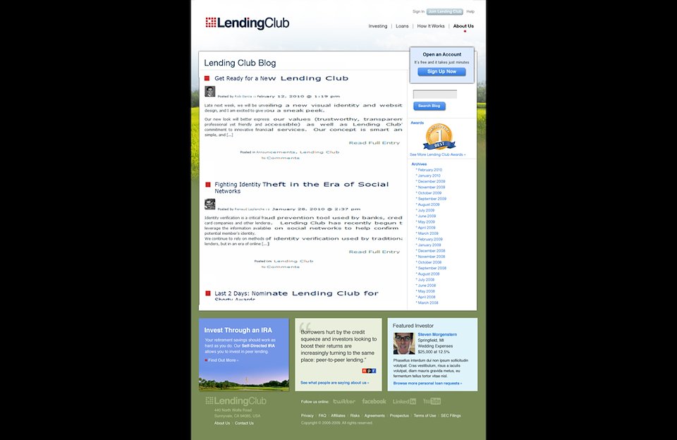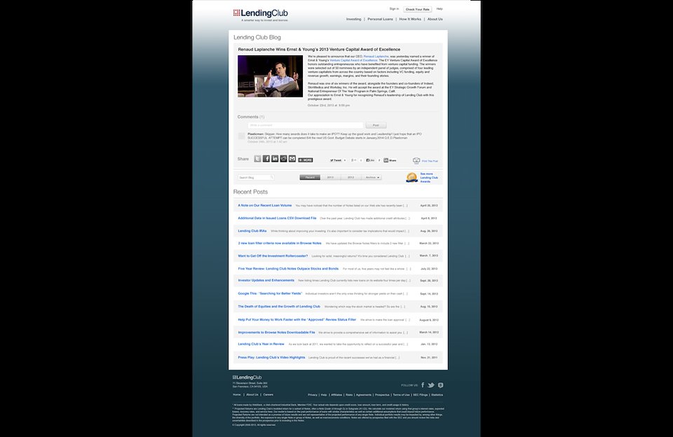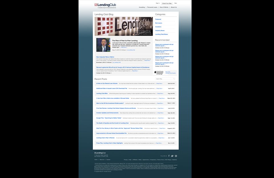 Final deliverable comps of the main blog page that introduces styles from other news related pages within the site. Also features a category and recommended posts section and a placeholder for hero images above. Shown below are archived posts from previous blog entries. http://blog.lendingclub.com/