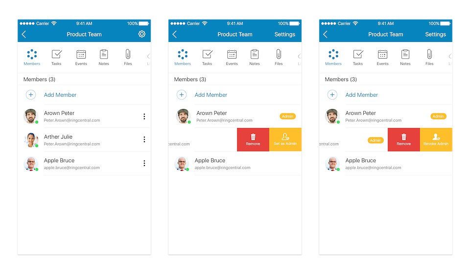 A team admin can tap a user’s profile from the conversations screen and has the ability to set/revoke as admin or remove user.