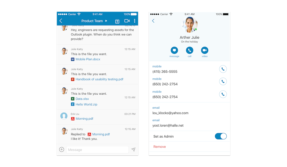 Also, by tapping on the title of the team conversation screen, an admin can view all the participants and can make any user an admin, or remove them.